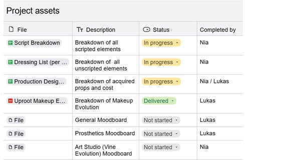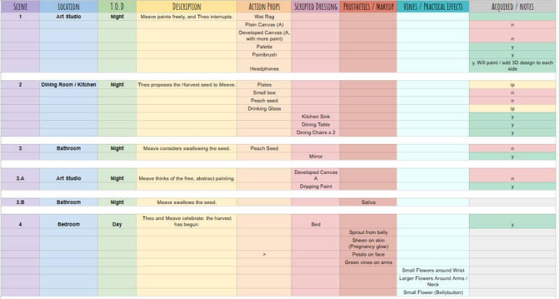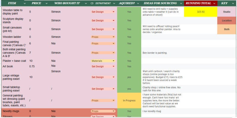 Below are examples of script breakdowns, unscripted dressing lists, asset distribution files and organisational materials that I have created for various projects. Being able to use Google Docs, create mood boards on Photoshop and sketching mock-ups in Sketchbook Pro allows me to provide fluid creative communication. Moreover, I am able to monitor the Art Department budget and ensure expenses remain minimal.